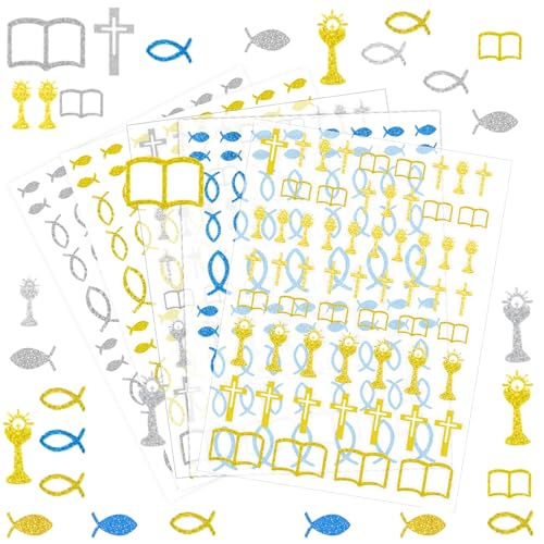 🐟 Breite Auswahl an Designs: Eine Vielfalt von 348 glänzenden Aufklebern, einschließlich 228 Fischen, 46 Kreuzen, 20 Heiligen Gralen und 32 Bibeln, steht zur Auswahl, erhältlich in Silber, Königsblau und Gold.