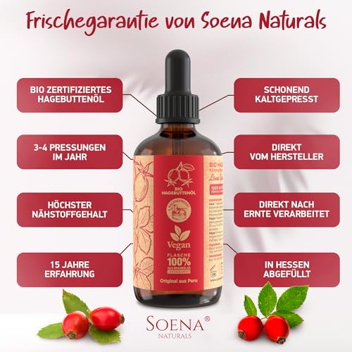 100% zertifiziertes BIO HAGEBUTTENÖL – Unser Bio Hagebuttenöl behält aufgrund der schonenden Kaltpressung den Großteil seiner wichtigen Inhaltsstoffe. Es ist massenweise an Vitaminen C, Mineralstoffen, Antioxidantien und 76% mehrfach ungesättigte Fettsäuren. Dank dieser Kombination und seinem talgregulierenden Effekt, ist das Öl bekannt als enorm o. k. für unreine, ölige, & trockene Haut angemessen.