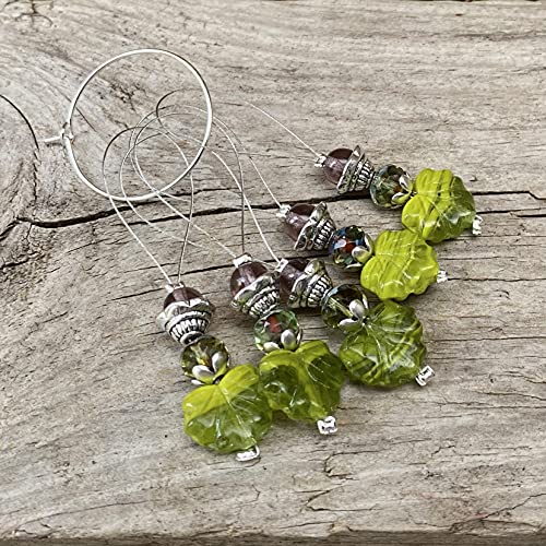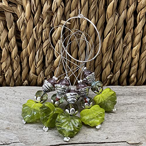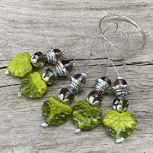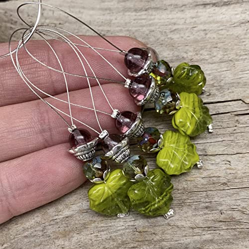 5 edle Blätter Maschenmarkierer mit böhmischen Glasperlen – Maschenzähler – grün, aubergine, silber – Set – Stricken, Strickhilfe stitch marker