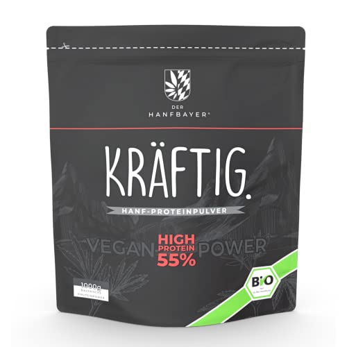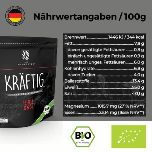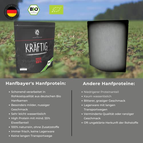 Der Hanfbayer® regionales Hanf Protein Pulver [MIT 55% PROTEIN] – inkl. LECKERE E-Rezepte – veganes Proteinpulver mit Magnesium & Aminosäuren für Muskelaufbau – wasserlösliches Hanfprotein