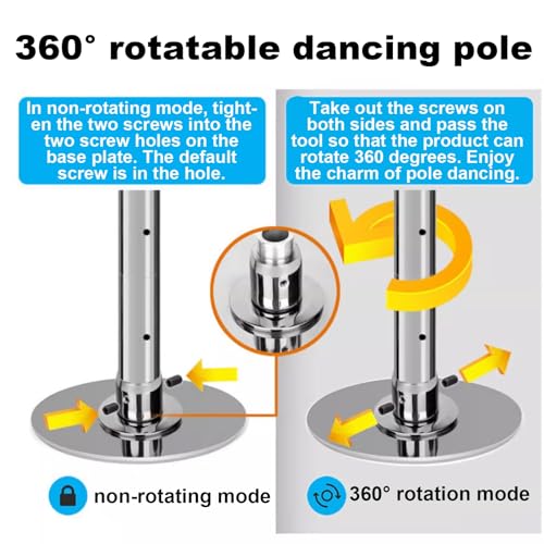 【Spinning- und Statischer Modus】 Je nach Bedarf können zwei Modi eingestellt werden. Ziehen Sie die untere Klemmschraube fest, die Tanzstange ist abgeschlossen, es handelt sich um den statischen Modus. Lungern Sie die Klemmschraube, dann können Sie den Drehmodus der Stange verwenden Das gesamte Set muss nicht gebohrt werden, keine Schäden an Wand und Decke. Zusammenbau erforderlich.