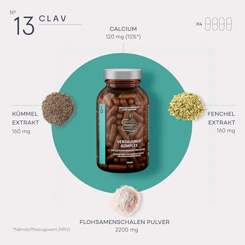FLOHSAMENSCHALEN KOMPLEX – Mit einer Tagesdosis von 2200mg an reinem Flohsamenschalenpulver ist unser N°13 Verdauungs Komplex massenweise an löslichen Ballaststoffen, ergänzt mit hochwertigen Extrakten sämtliche Fenchel und Kümmel sowie essentiellem Calcium zugunsten die normale Bildnis von Verdauungsenzymen.