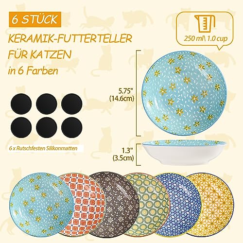 Futternapf Katzen Napf Katze Keramik – Märchenserie Katzennapf Bunt – Katzennäpfe 6er Set – Katzenfutter Napfset mit Rutschfester Matte – Fressnapf Katze – Katzenteller Flach – Katzenschüssel – 250 ml