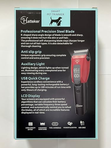 Leiser & geräuscharmer Anlage: Ohne Lärm zu erzeugen, können Sie Haustiere ruhig halten und genießen Sie die Pflege mit dieser hatteker Hundeschermaschine.Niedrige Lautstärke, die alias empfindliche Haustiere schnell drauf setzen. Sie müssen nicht fummeln, um Ihr Haustier zu beruhigen, und effektiv trimmen auf der Stelle! Ideal für Ihre Haustierschermaschine.