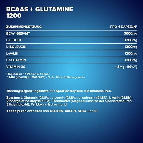 HOHE DOSIERUNG: Die 100% BCAAs + Glutamine 1200 Kapseln sind hochdosiert, Mithin der maximale Erfolg erreicht werden kann. Pro empfohlener Tagesportion von 4 Kapseln werden im Allgemeinen 3600mg BCAAs und 1200mg L-Glutamin aufgenommen