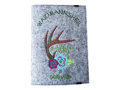 Jagdscheinhülle, Filzhülle Jagdschein, WBK, Jäger, Männergeschenk, Waidmannsheil, individualisierbar, Namensbestickung, Hut, Hirsch Blumengeweih, Boho