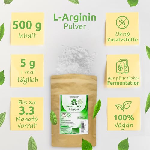 L- Arginin Base Pulver 500 Gramm – 100% ohne Zusatzstoffe – reinstes Arginin Pulver in Premiumqualität von Bio Protect immer frei von Magnesiumstearat und anderen Zusatzstoffen