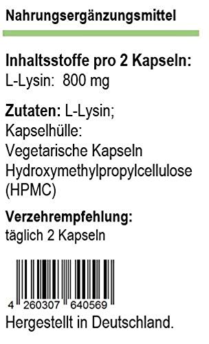 L-Lysin, 60 Kps., 400 mg., Reinsubstanz ohne Zusatzstoffe, vegetarische Kapselhülle, deutsche Produktion