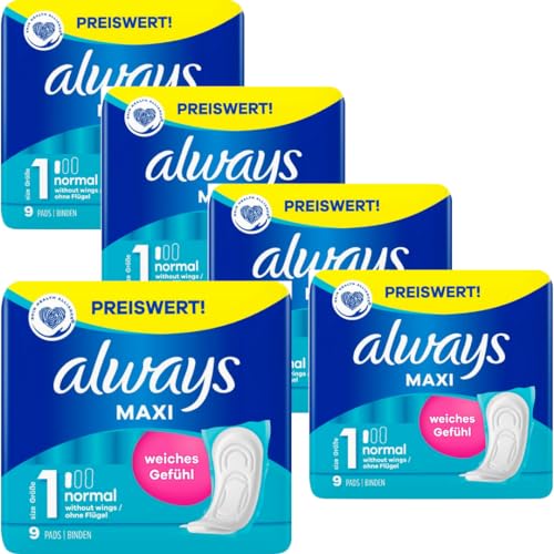 Maxi Damenbinden Normal (Größe 1) Pads Damenbinden 9 STÜCK x 5 Packungen