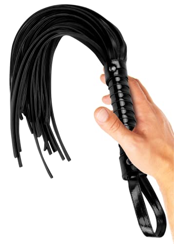 Die Länge der schwarzen Peitsche beträgt 47 cm. Der Anfasser der kleinen Peitsche ist 15 cm.
