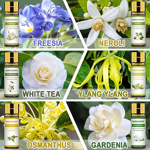 【12 Blumige ätherische Öle】- MIGCAPUT Ätherische Öle werden aus der ganzen Welt bezogen, einschließlich Damaszener Rose, französischer Lavendel, deutscher Kamille, Geranie, Ylang Ylang, Jasmin, Orangenblüte, Weißer Tee, Gardenie, Osmanthus, Kirschblüte, Freesie. Jedes Blumenöl hat sein einzigartiges Aroma.Mit ihren vielfältigen Vorteilen sind diese blumigen ätherischen Öle die beste Wahl für Frauen.
