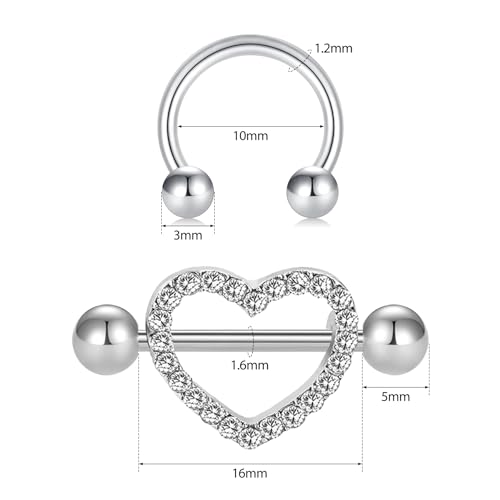 NIUSIMAN Nippelpiercing Chirurgenstahl Schmuck,14G Silber Zungenpiercing Kunststoff Nippelpiercing Herz Edelstein Piercing Nippel Körperschmuck Barbel CZ für Frauen Mädchen Liebhaber Valentine