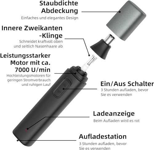 Elektrischer Nasen-/Ohrenhaartrimmer: Unser Nasenhaartrimmer via doppelschneidigen Klingen, doppelschneidigem Spinnklingensystem via Schutzabdeckung, entfernt überschüssige Haare von Nase und Ohren und verleiht Ihnen einen gepflegten und stilvollen Bartlook.