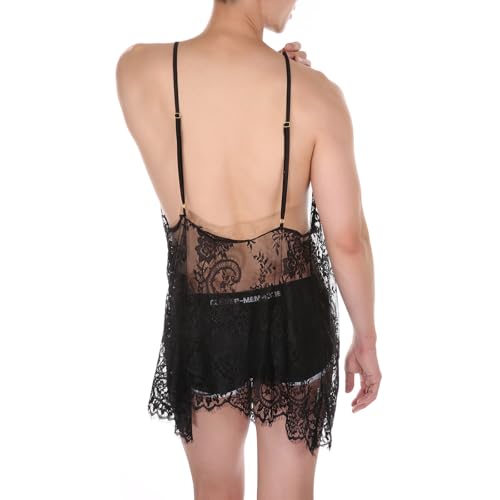 pochikiki- Herren Spitze Camisole Erotische Nachtwäsche Frech Sexy Schwarz Spitze Nachthemden Sissy Kleidung Spitzenkleid