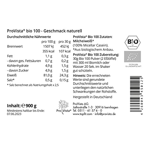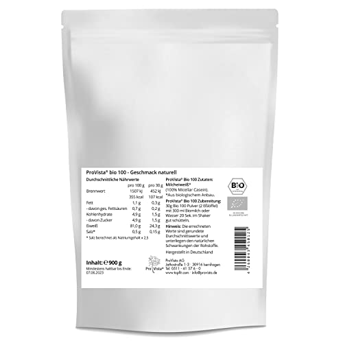 ProVista Bio Protein Natural – Eiweiss Shake Micellar Casein oder Whey (Molkenprotein) aus Bio-Milch ohne künstliche Zusatzstoffe 900g