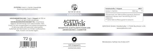 QIDOSHA® Acetyl L Carnitin Kapseln bioaktiv, erhöhte Bioverfügbarkeit, 120 Kapseln/Glas, 500mg/Kapsel, vegan, bioaktive acetylierte Form der Aminosäure L-Carnitin, in Deutschland produziert