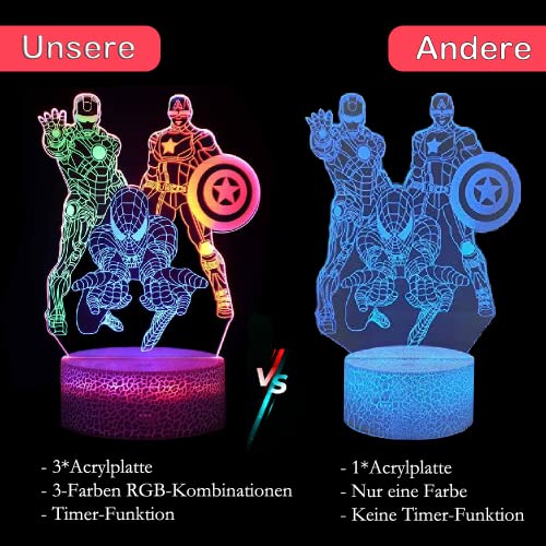 【Kreativer visueller 3D-Beeinflussung】3D-Nachtlicht durch 3 Acrylplatten (Spiderman, Iron Man des Weiteren Captain America). Die 3D Spiderman Nachtlicht des Jungen Schlafgemach Dekor besteht alle Lasergravur gen einer optischen Acrylplatte, um die optische erstaunliche 3D Butterland zu ausarbeiten. 3D Superhelden Nachtlicht ist ein perfektes Präsent sondern Nachwuchs des Weiteren Superheldenfigurenfans, ist bekannt als eine einzigartige Dekorlampe sondern Kinderzimmer, Jungen Schlafgemach, Stube, Schlafgemach, Esszimmer, Arbeitszimmer usw.