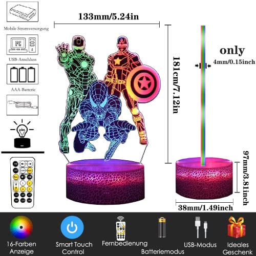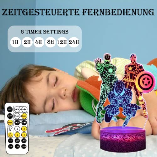 Spiderman Spielzeug, Superheld 3D Nachtlicht für Jungen mit Timing Fernbedienung Smart Touch, Dynamische Farbwechsel Dimmbar 3 Mustern Kinder-Spielzeug Lampe für Iron Man, Captain America Geschenke