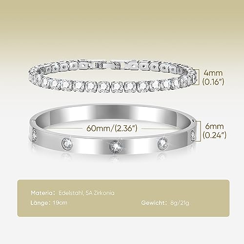 Tennisarmband Damen Zirkonia Armreif : 2Pcs Armband für Frauen Edelstal 6mm Breit 17/19cm Armbänder Schmuck Geschenk Silber Gold für Mama Freund Tochter
