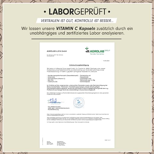 🔬 MADE IN GERMANY & LABORGEPRÜFT: Die Herstellung der VITAMIN C Kapseln findet ausschließlich in Deutschland statt und unterliegt somit den strengen deutschen Richtlinien zur Herstellung von Nahrungsergänzungsmitteln sowie unangekündigten Kontrollen. Wir lassen die VITAMIN C Kapseln regelmäßig durch ein unabhängiges Lebensmittel-Labor untersuchen und können somit eine höchstmögliche Qualität garantieren. Analysezertifikat siehe 5. Bild in der Produktbildergalerie.