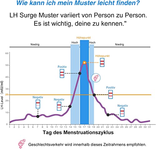 Enthält 50 Ovulationsteststreifen und 50 Urinbecher zur einfachen und bequemen Vorhersage Ihres fruchtbarsten Tages.