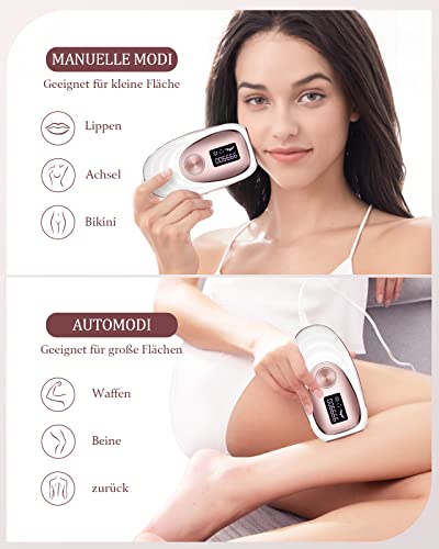 【2 Einstellbare Blitzmodi】 Das laser haarentferner hat sowohl automatische als auch manuelle Modi, der manuelle Modus (Einzelblitz) ist für die Entfernung von Haaren in kleinen Bereichen wie Bikinizone, Gesicht und Achselhöhlen geeignet, während der automatische Modus (Dauerblitz) für große Bereiche wie Rücken, Arme und Beine geeignet ist.